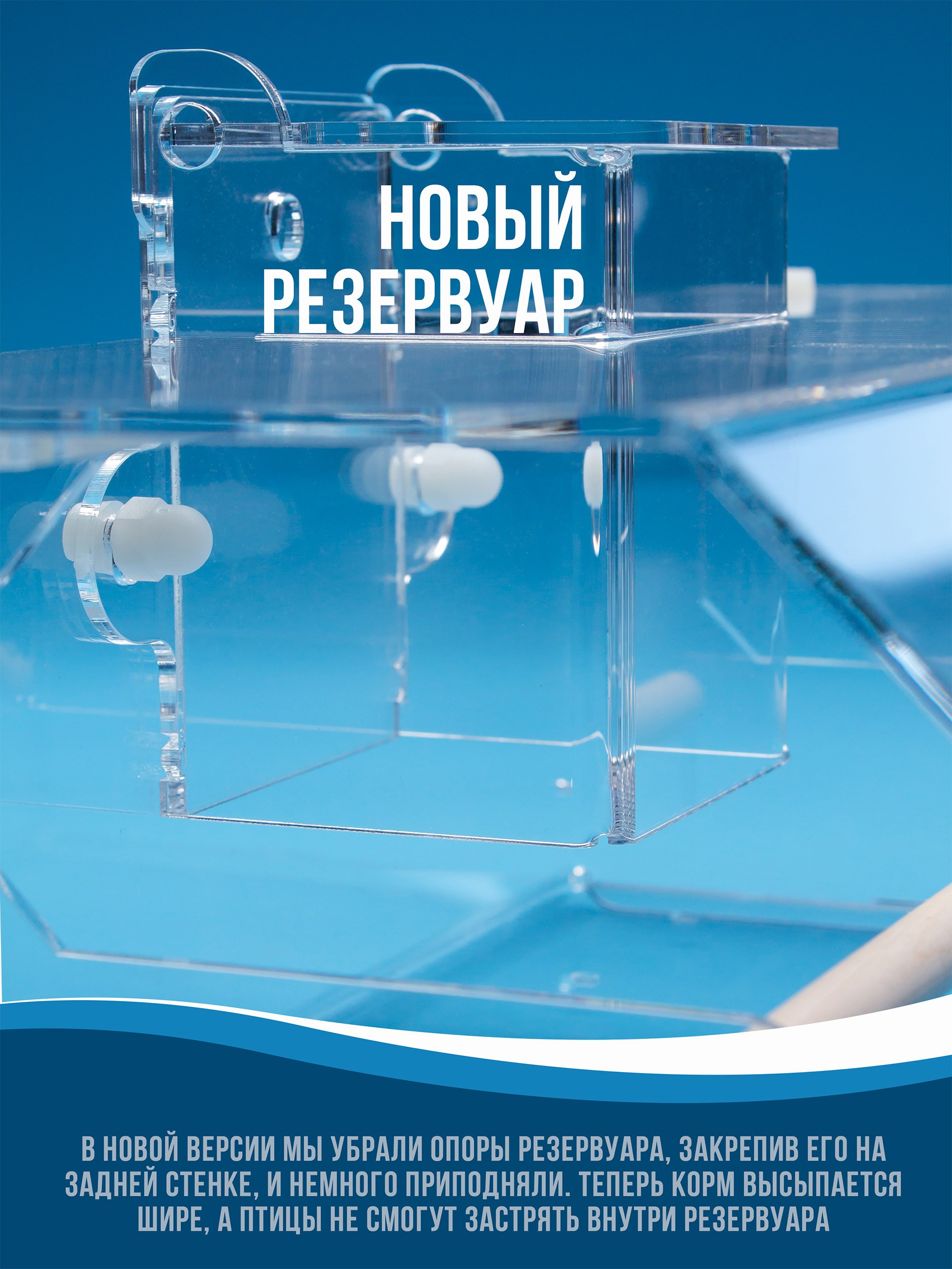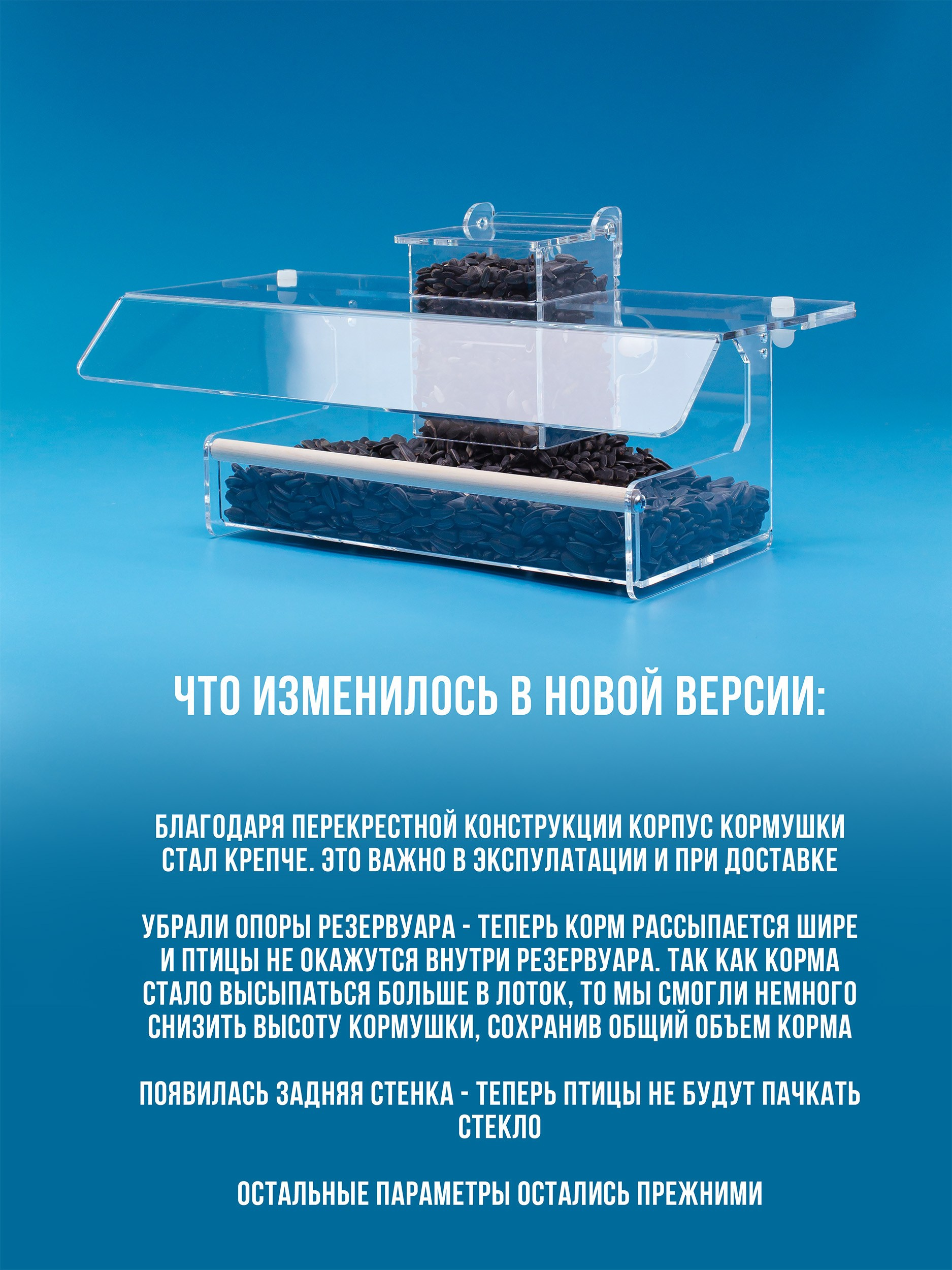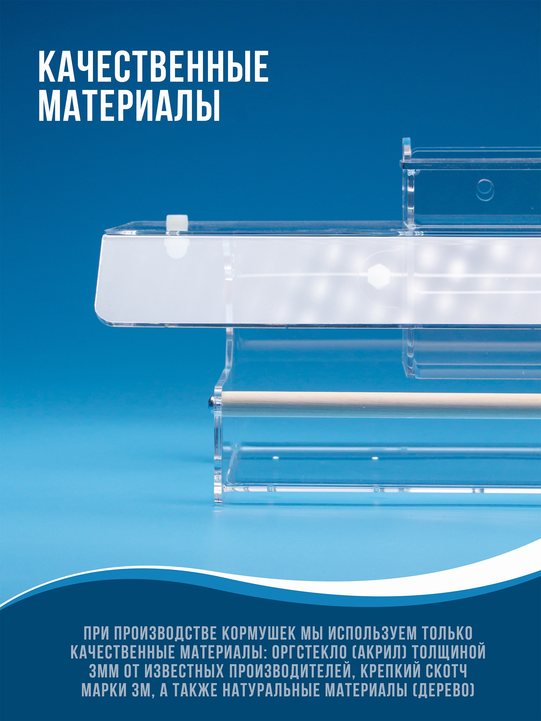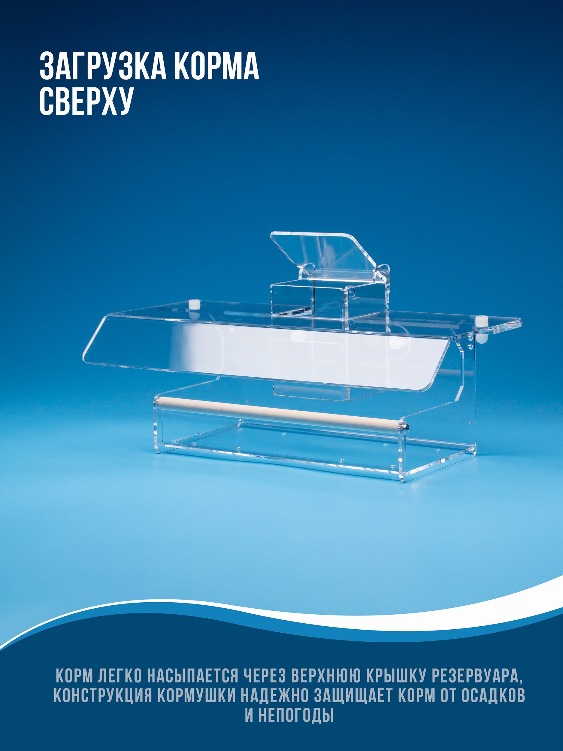 Корпус изготавливается из качественного прозрачного оргстекла (акрила, 3мм). Кормушка просто и надежно крепится. На дне лотка имеются дренажные отверстия. Корм можно легко насыпать через верхнюю крышку.