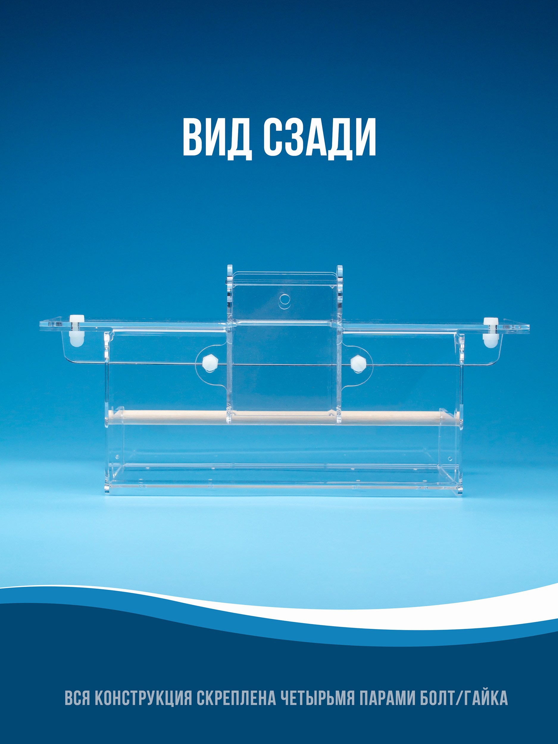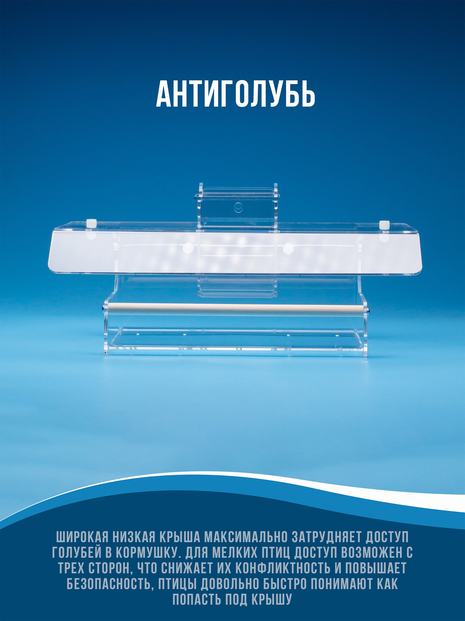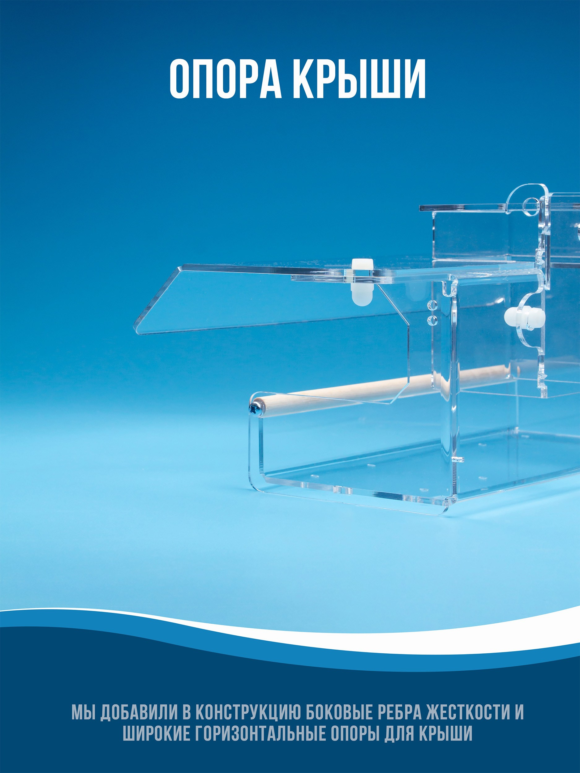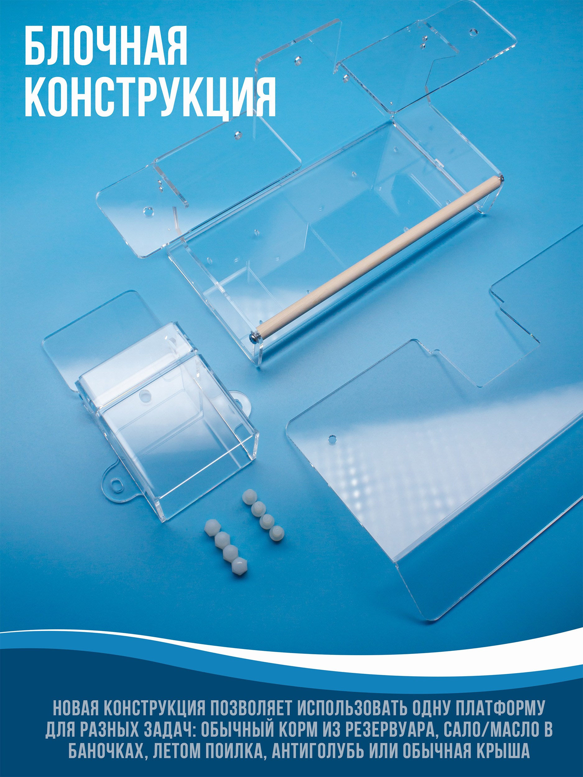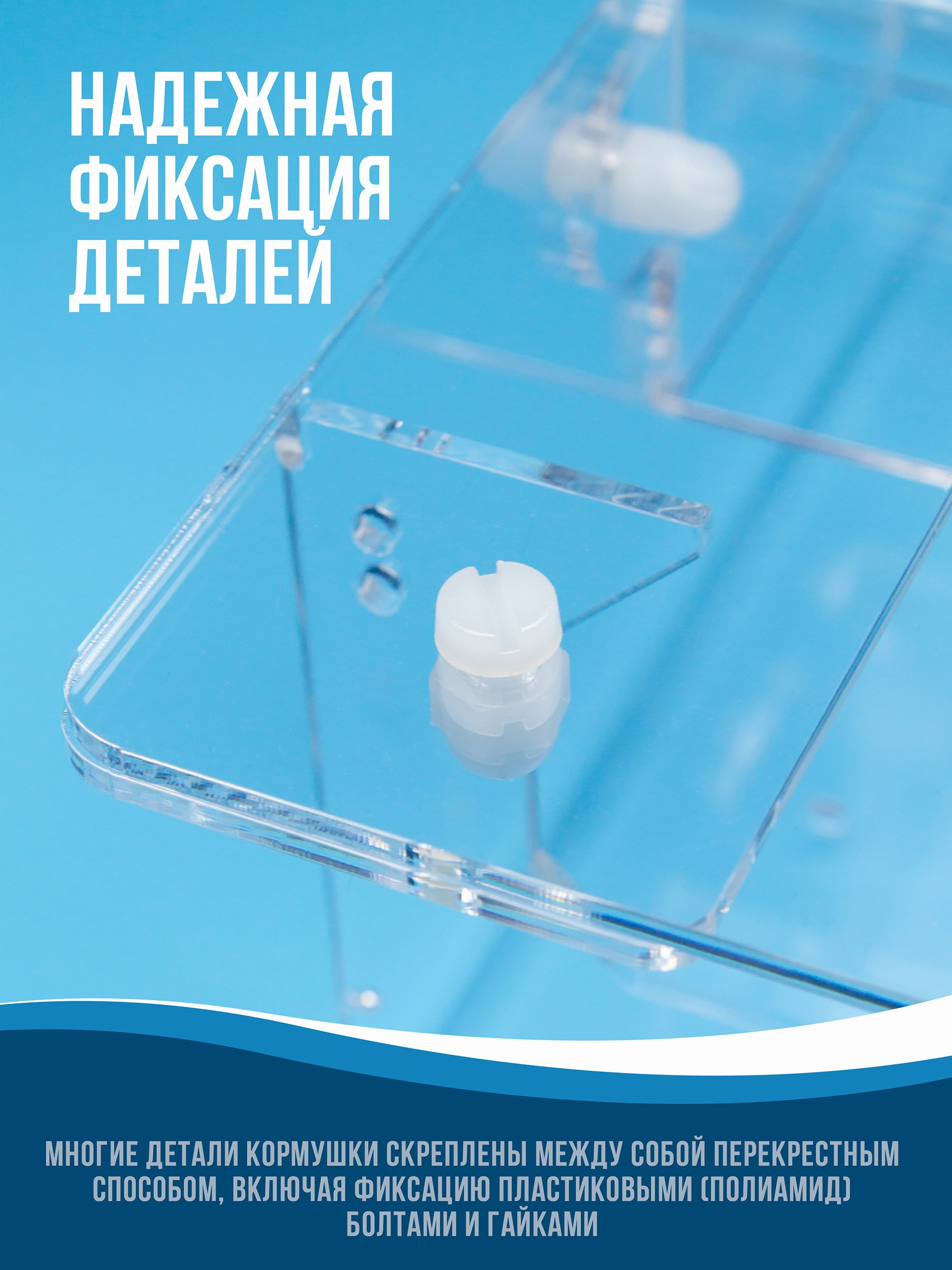 Корпус изготавливается из качественного прозрачного оргстекла (акрила, 3мм). Кормушка просто и надежно крепится. На дне лотка имеются дренажные отверстия. Корм можно легко насыпать через верхнюю крышку.