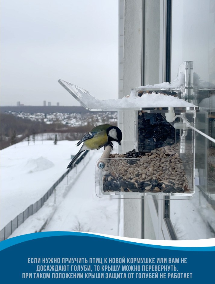 - Крышу можно переворачивать вверх ногами, если не нужна защита от голубей или необходимо приучить птиц к новой кормушке;