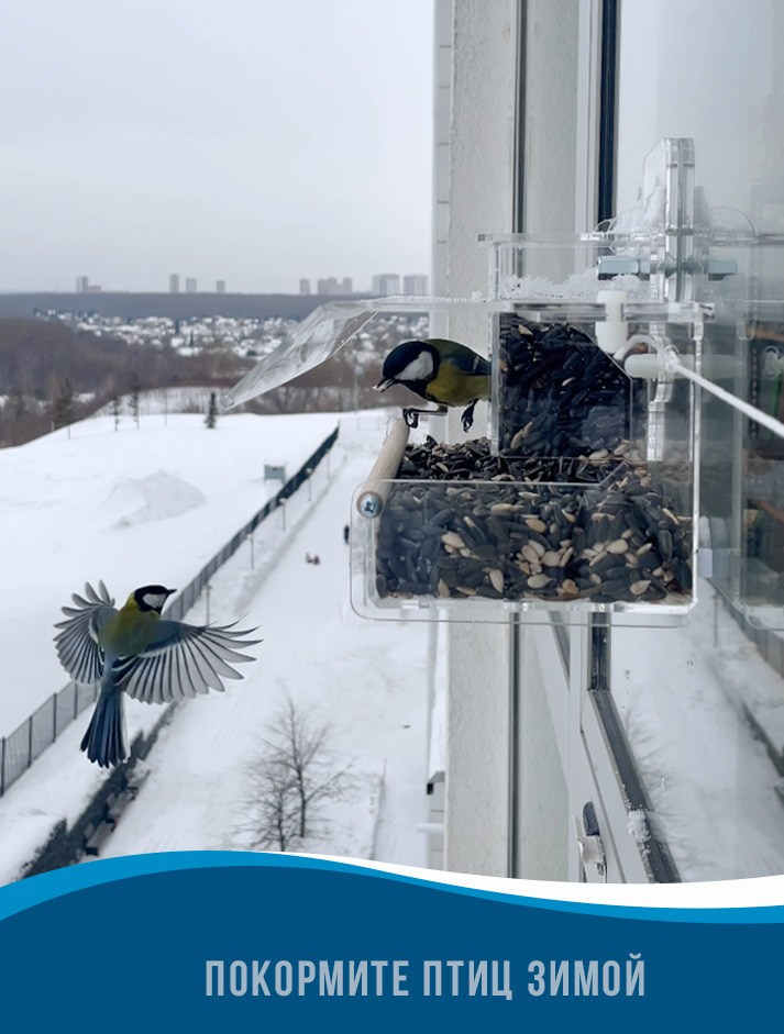 Корпус изготавливается из качественного прозрачного оргстекла (акрил, 3мм). Кормушка просто и надежно крепится на крепление на скотче, которое клеится на стекло снаружи. На дне лотка кормушки имеются дренажные отверстия. Корм можно легко насыпать через верхнюю крышку.