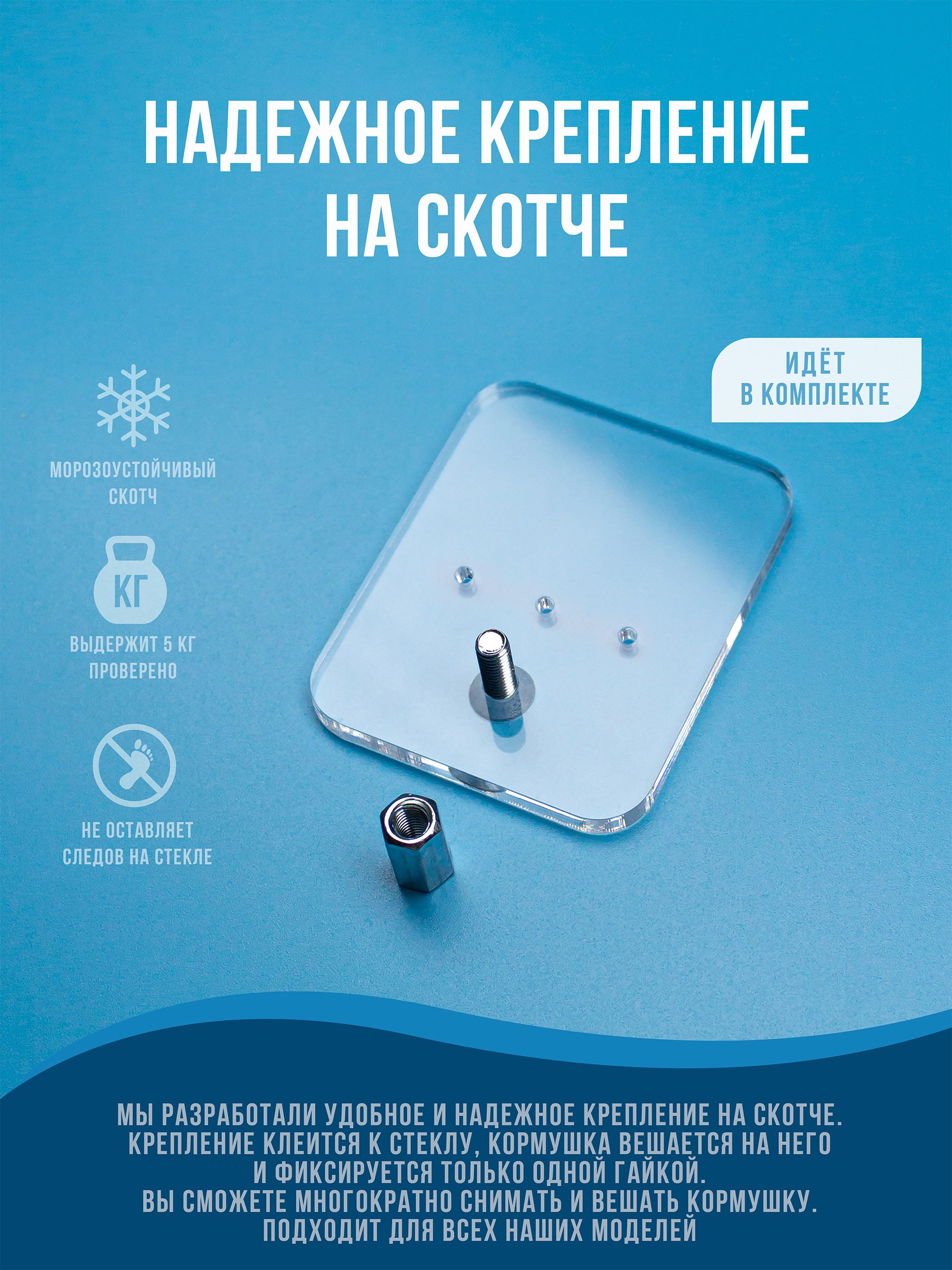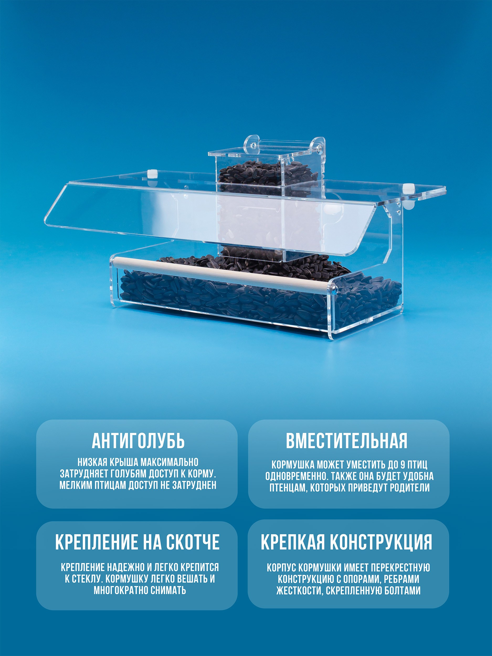 Элементы корпуса скреплены между собой конструктивно, а также проклеены качественным прозрачным клеем в ключевых местах. Кормушка имеет надежное крепление на скотче, которое клеится на стекло снаружи.